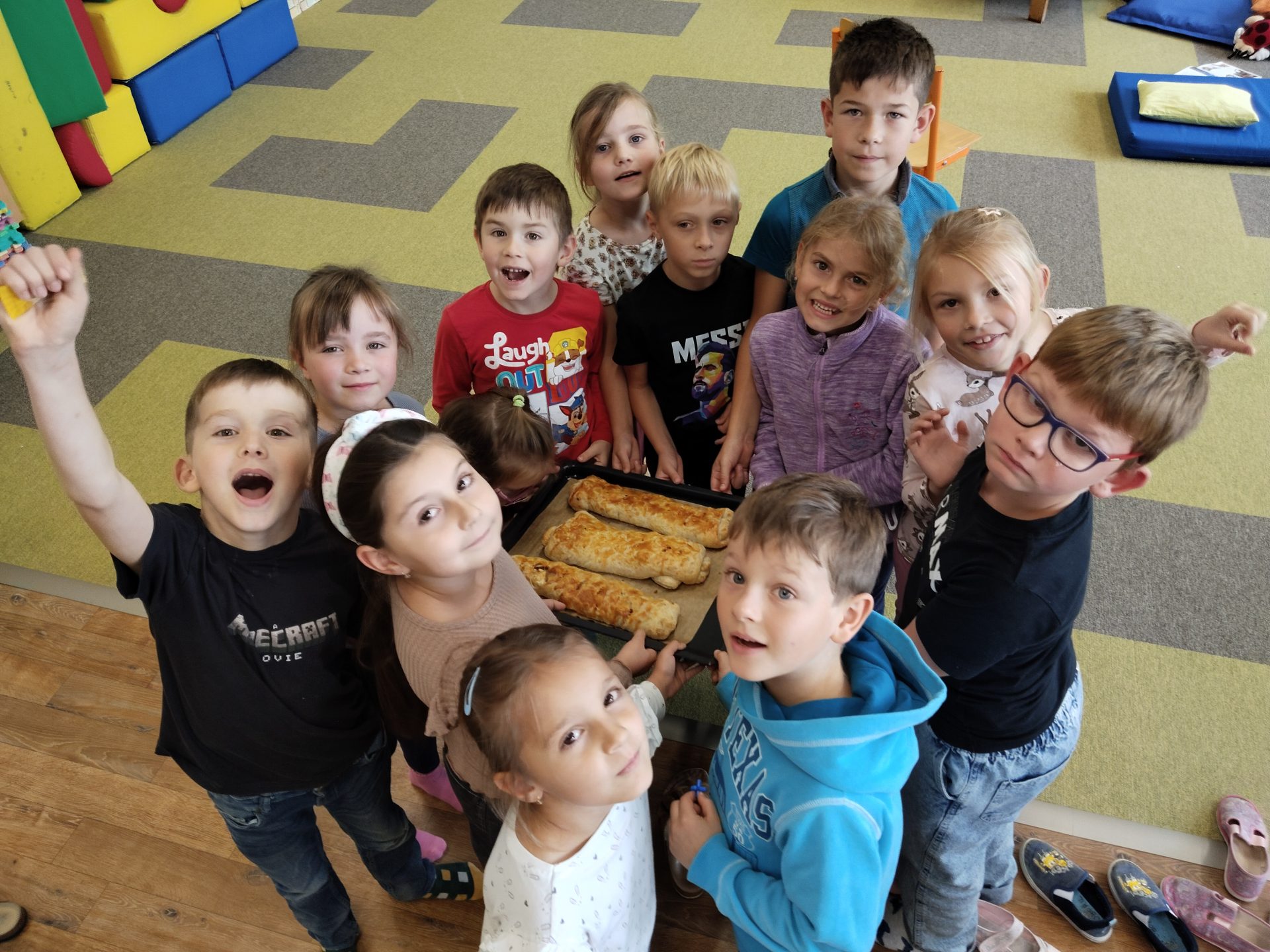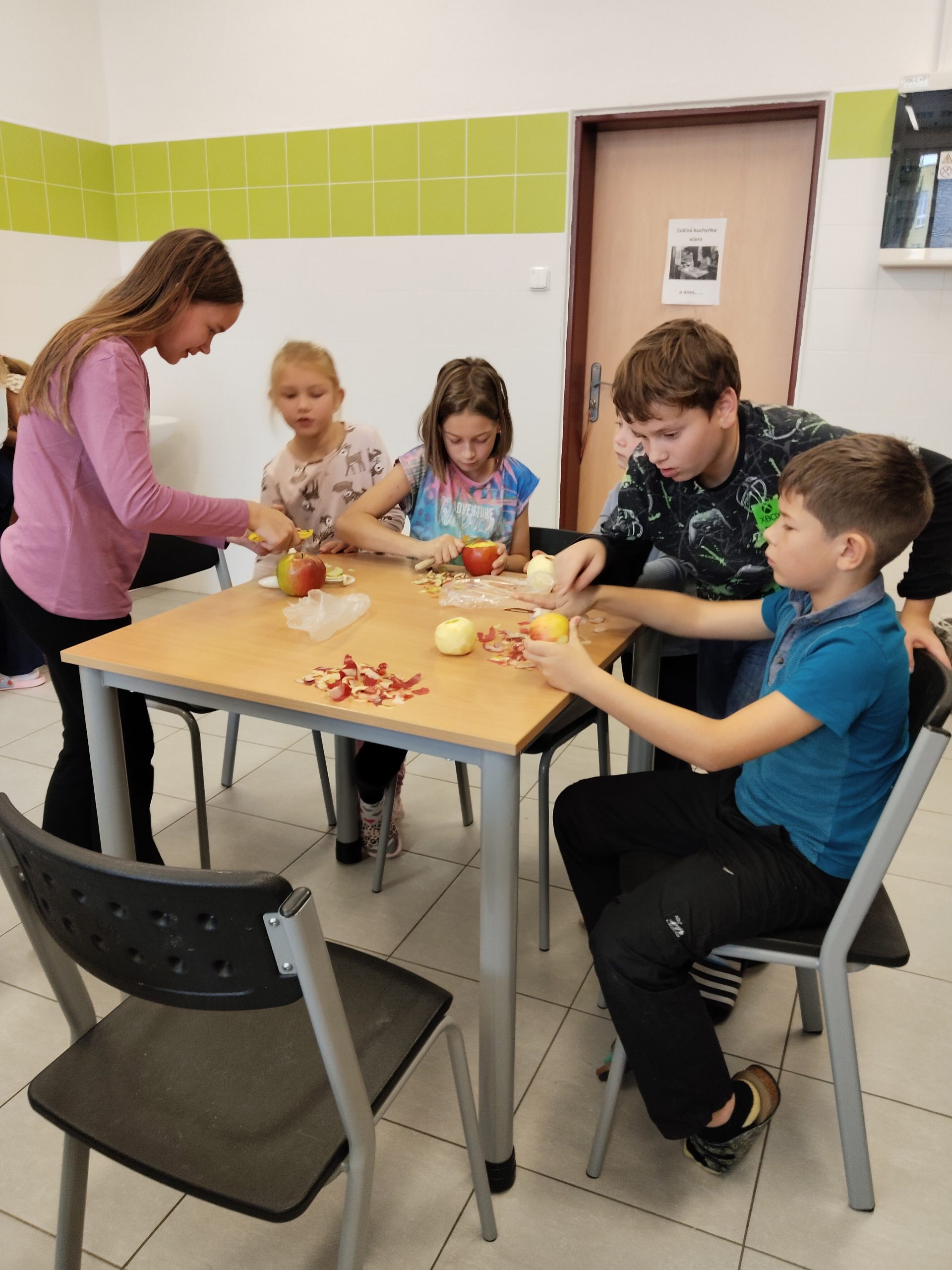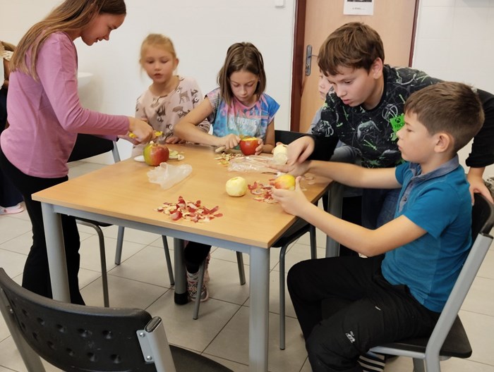 Děti z 5. B a 1. A pod vedením paní učitelek a slečny praktikantky se rozhodly, že si upečou štrúdly. Starší děti si ochotně vzaly pod svá křídla prvňáčky a pomáhaly jim s loupáním a krájením jablíček na kostičky. Všem šla práce pěkně od ruky. I ti nejmenší si vedli skvěle. Nakrájeli tolik jablek, že je sami nestačili sníst, a tak se o ně s radostí podělili s ostatními dětmi v družině.