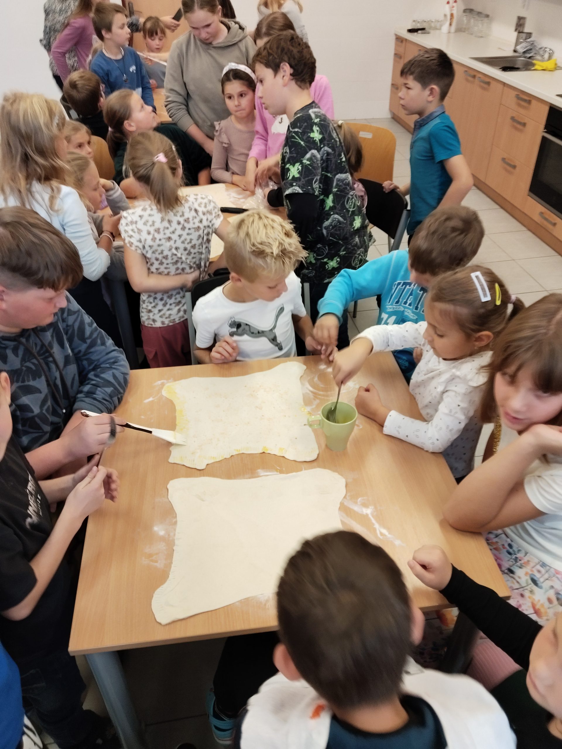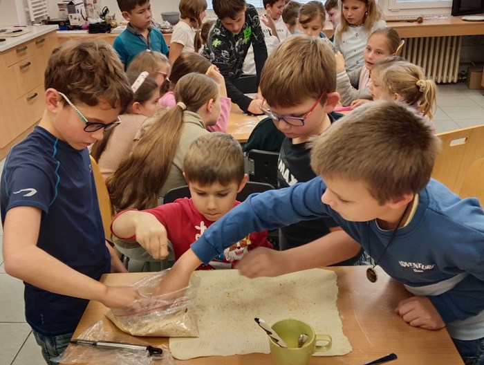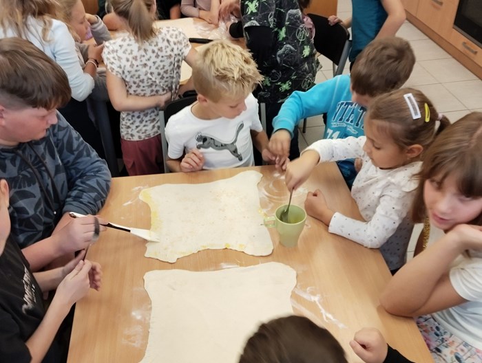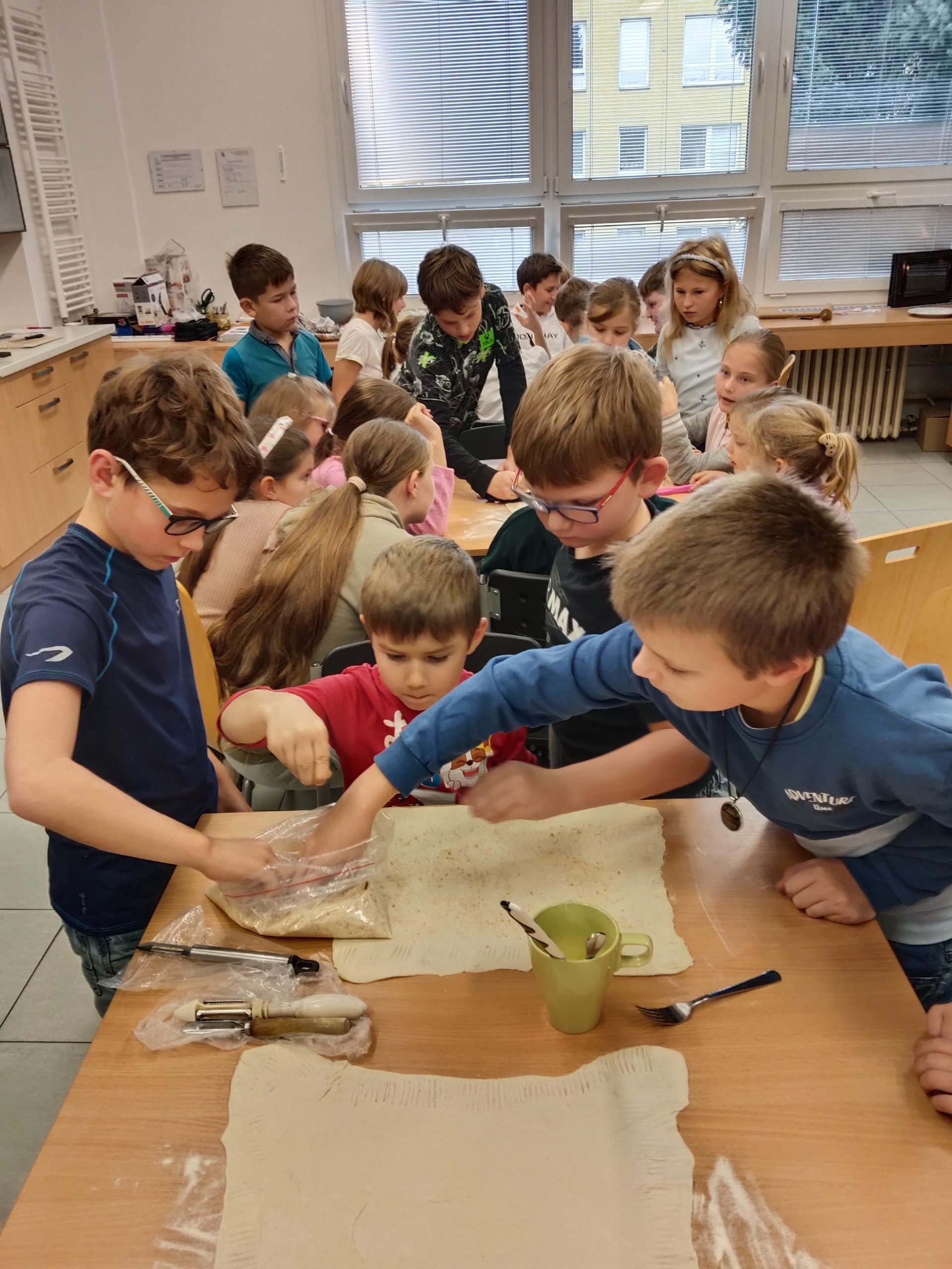 Společně se naučili, co všechno do takového jablečného štrúdlu patří. Pak už jen zbývalo počkat, až štrúdl v troubě pěkně zezlátne – a bylo hotovo. Celá kuchyňka se provoněla nejen skořicí, ale i vůní přicházejícího podzimu. Je vidět, že máme ve škole plno šikovných malých pekařů.