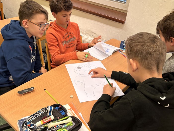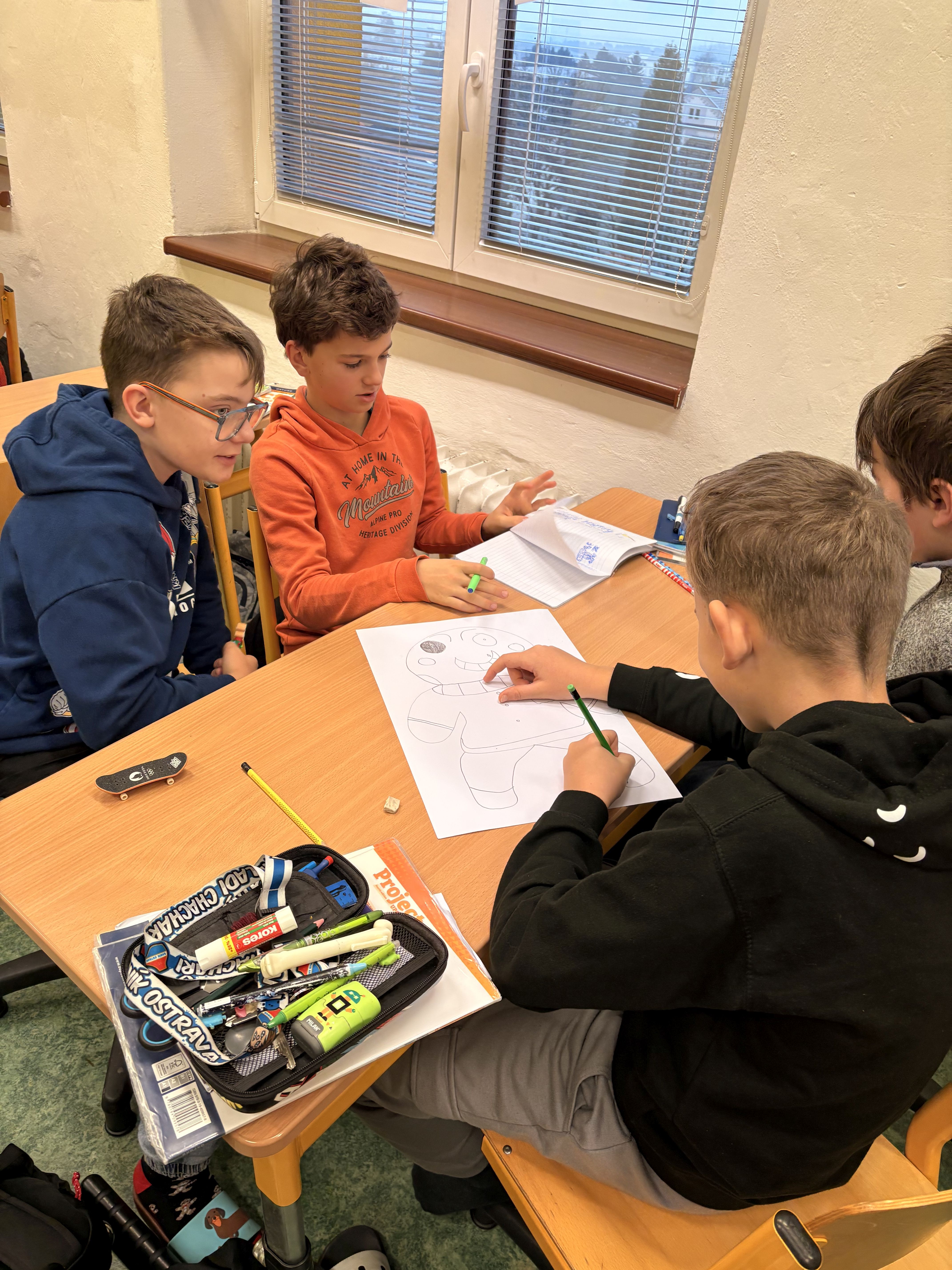 Každá skupina pracovala na svém návrhu s velkým nadšením – děti se nejen pustily do kreslení, ale také vymýšlely zajímavé charakterové rysy a vzhled svých postaviček. V popisech pak zaznívala nejrůznější spojení jako například “It has big green eyes”, “It has a red hat” nebo “It has a long snowy beard”.