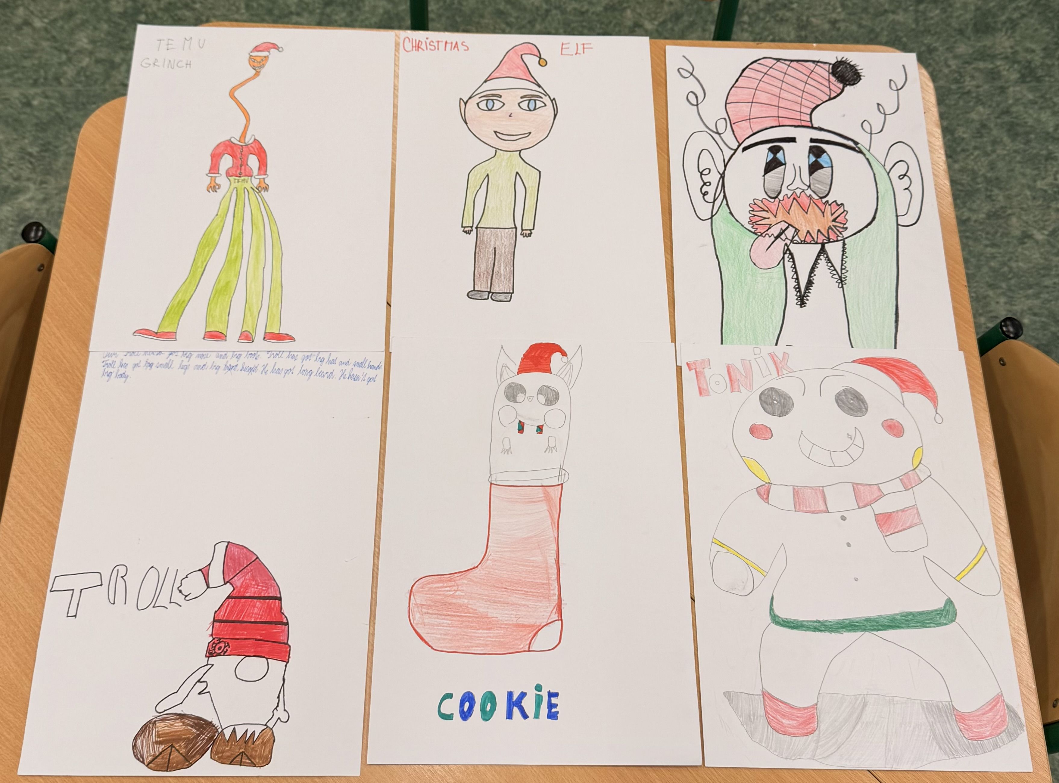 V rámci prosincové projektové hodiny dostali žáci VI. A kreativní úkol: ve skupinách navrhnout a nakreslit originální vánoční postavičku, vymyslet jí jméno a poté ji společně anglicky popsat.