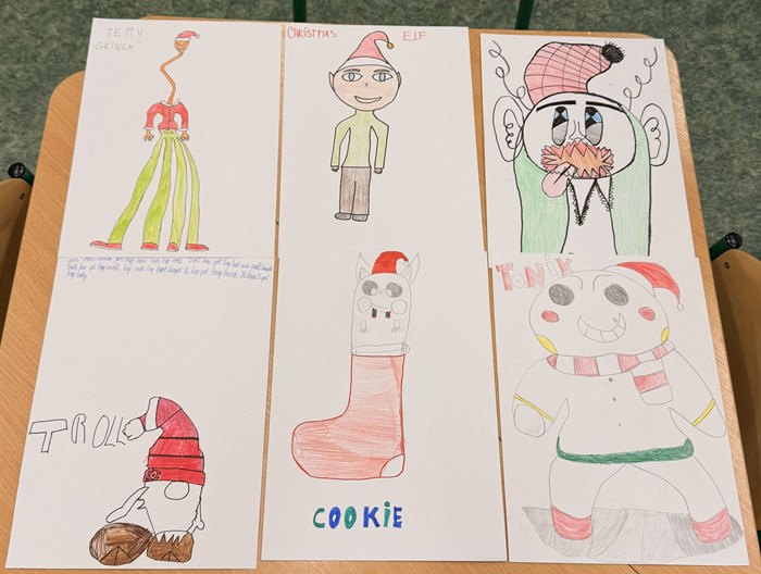V rámci prosincové projektové hodiny dostali žáci VI. A kreativní úkol: ve skupinách navrhnout a nakreslit originální vánoční postavičku, vymyslet jí jméno a poté ji společně anglicky popsat. Hlavním cílem bylo procvičit a zautomatizovat používání sloves to have („mít“) v různých spojeních, která si žáci v posledních týdnech osvojovali.