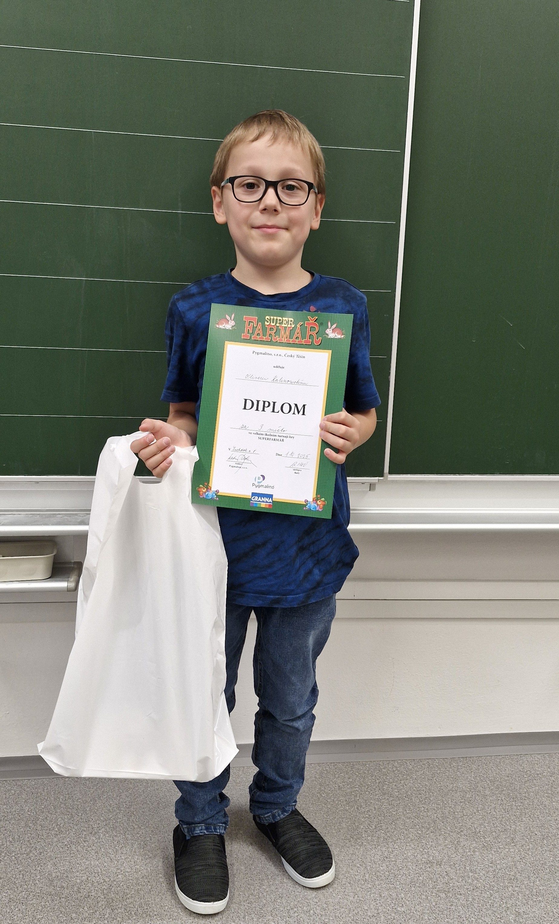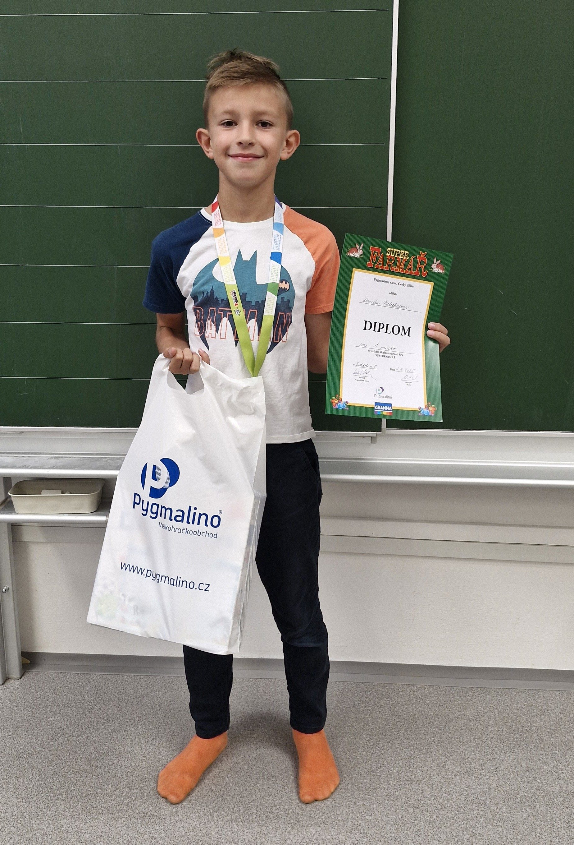 Na 3. místě se umístil Oliver Kalinowski ze 3.A, na 2. místě pak Daniel Žlebek ze 3.B a 1. místo ovládl David Melichar ze 4.B. Žáci obdrželi diplomy a krásné ceny v podobě deskových her z e-shopu Pygmalino.