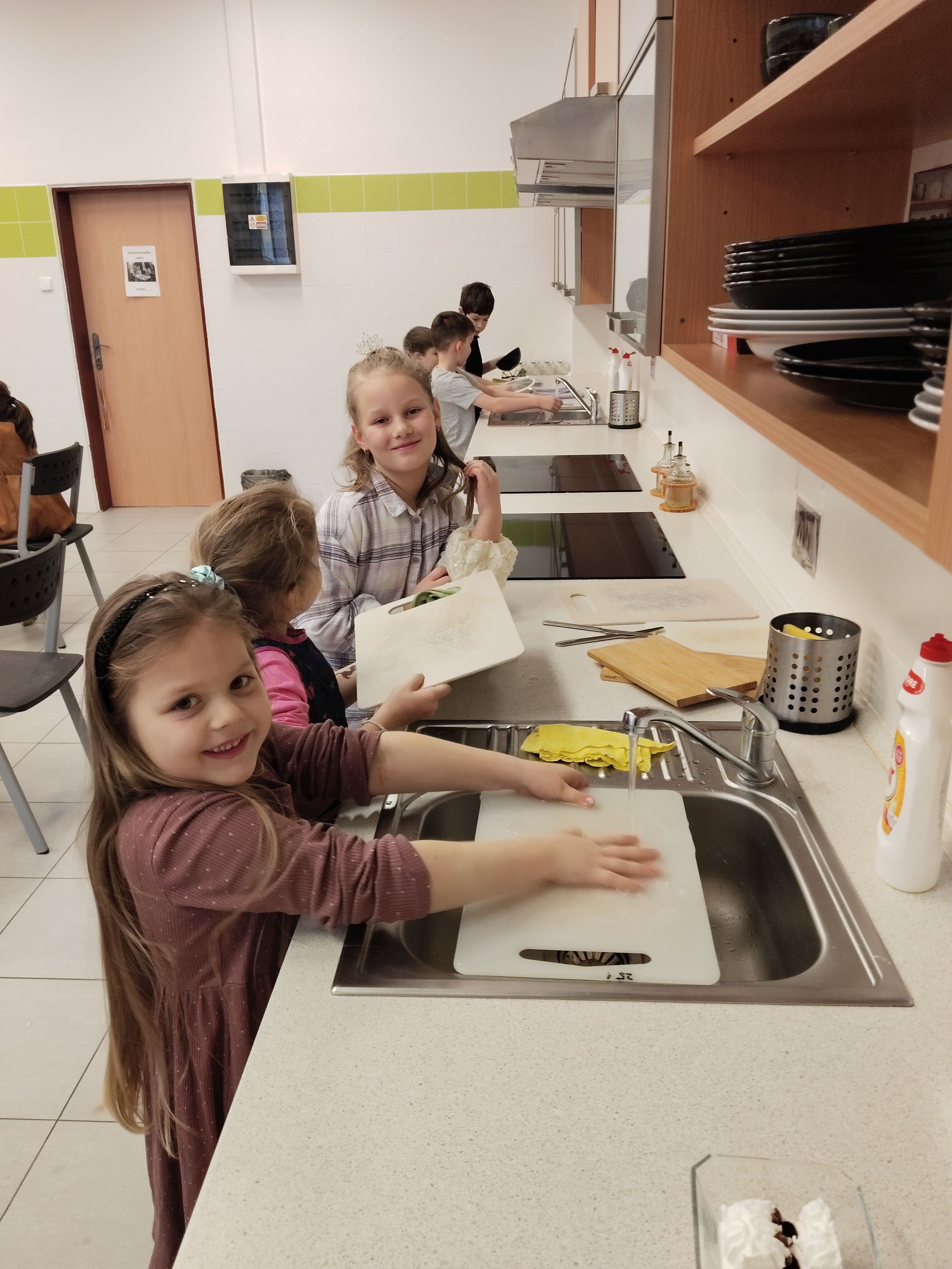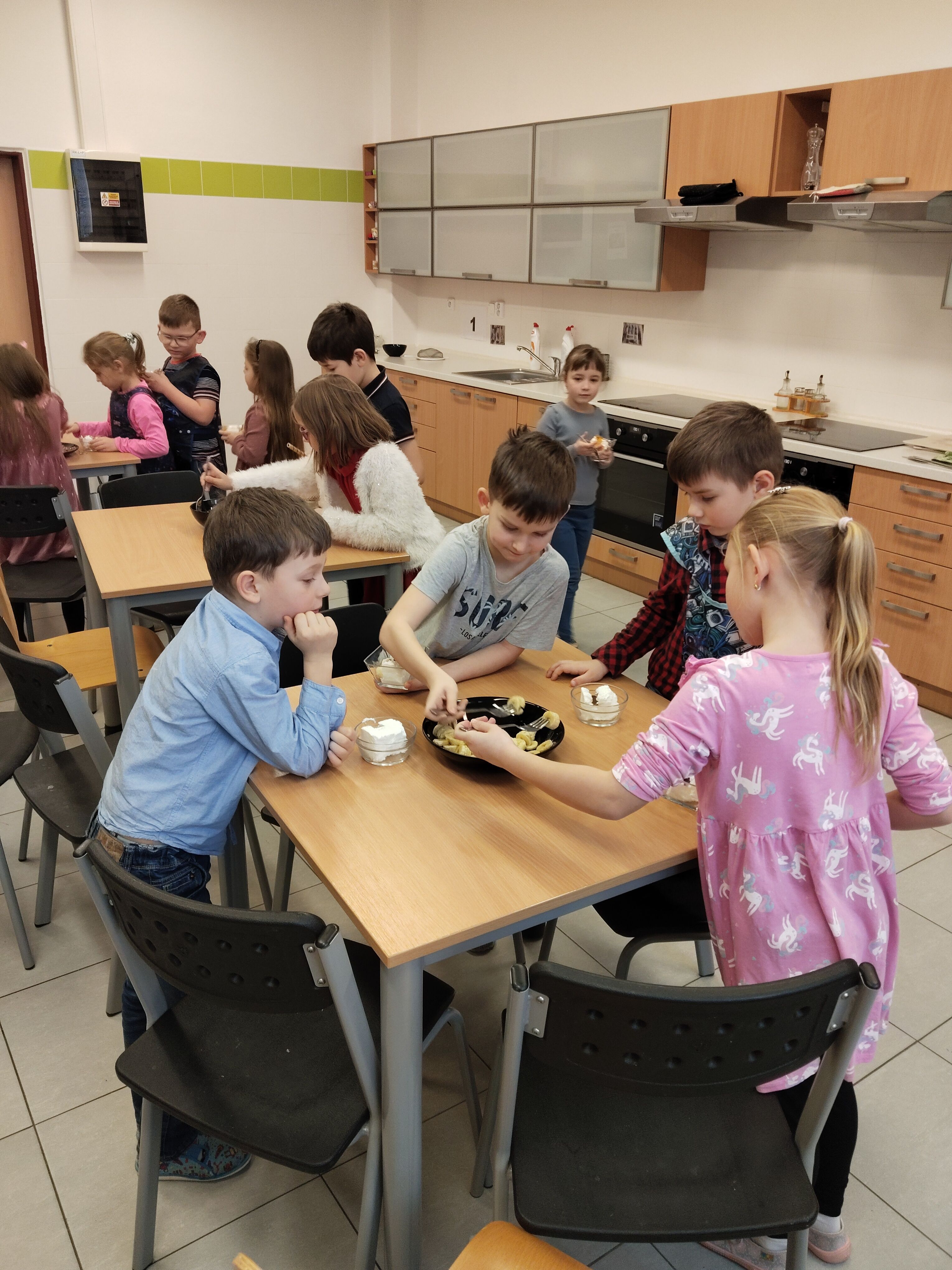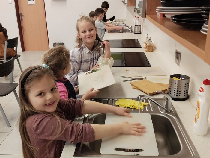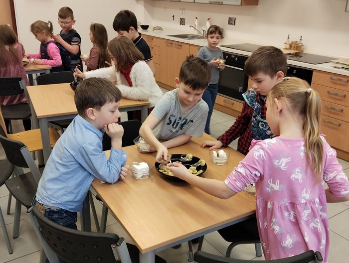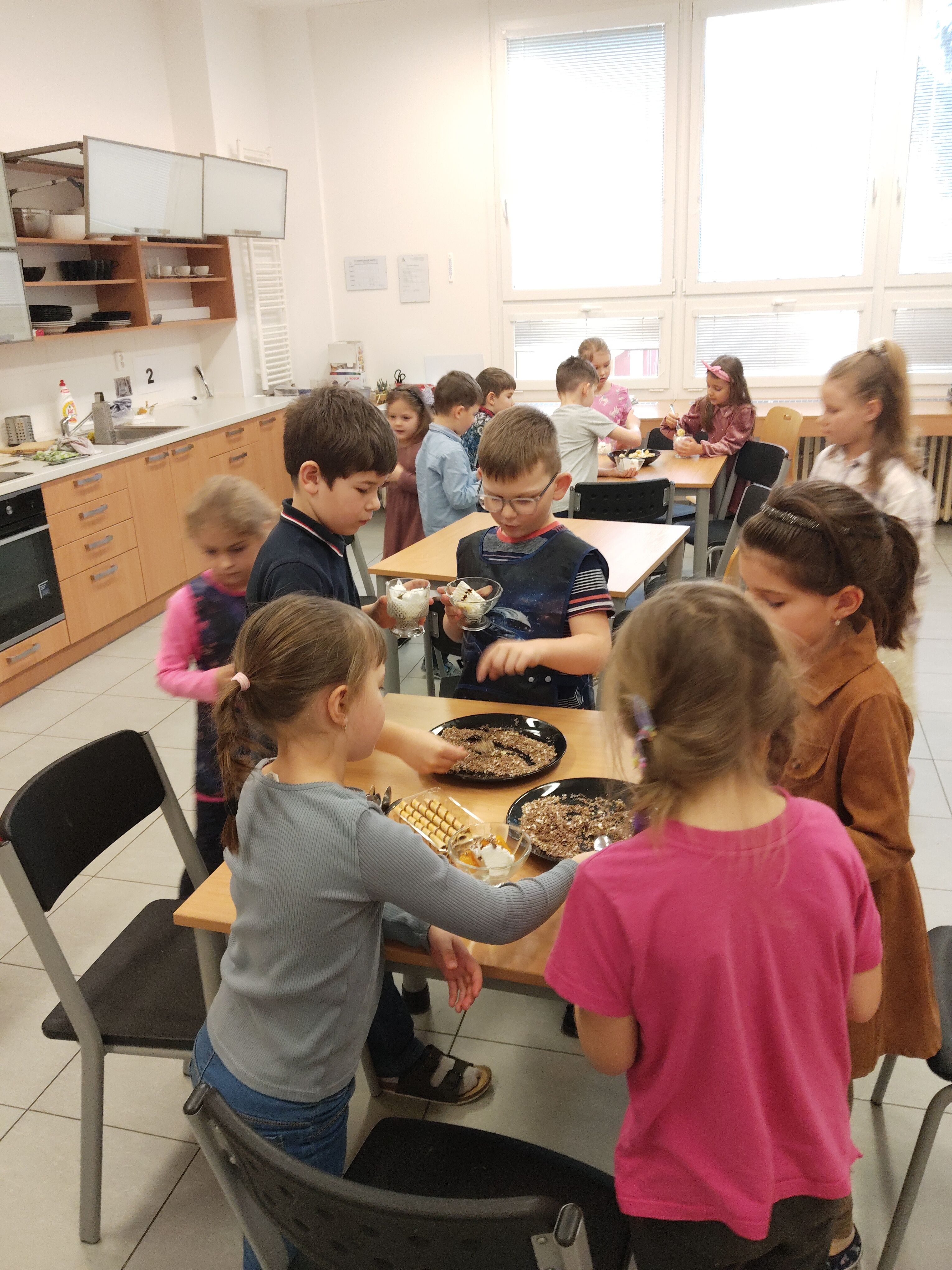 Odměnou jim nebyly jen známky, ale také si pochutnali na poháru. Ve skupinkách oloupali, nakrájeli banány, meruňky, nastrouhali čokoládu. Těmito ingrediencemi ozdobili pohár s nanukovým dortem a „třešničkou na dortu“ byla čokoládová trubička. Děti mohly být hrdé na své dosud osvojené vědomosti ale i dovednosti a zručnost. Přejeme jim elán, úsměv na rtu i v dalším pololetí.