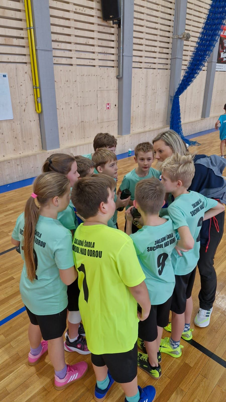 Ve třetím utkání jsme nastoupili proti ZŠ Odry Pohořská a po soustředěném výkonu jsme si připsali další výhru 12:4. Závěrečný duel se ZŠ Galaxie byl pro nás nejtěžší. Soupeři hráli velmi zkušeně, rychle měnili tempo hry a jejich zatažená obrana nám dělala velké problémy. I přes snahu se nám nedařilo prosadit se střelbou z dálky ani průniky. Soupeř využil každé naší chyby a postupně navyšoval náskok. Výsledek 9 : 19 je sice jednoznačný, ale i přes porážku se děti nevzdaly a bojovaly až do konce. Díky dvěma vítězstvím a bojovnému výkonu ve všech zápasech si náš tým nakonec z turnaje odváží krásné 3. místo.